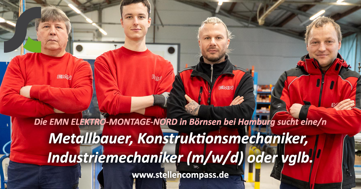 Die EMN ELEKTRO-MONTAGE-NORD in Börnsen bei Hamburg sucht zum nächstmöglichen Zeitpunkt eine/n Metallbauer, Konstruktionsmechaniker, Industriemechaniker (m/w/d) o. vglb., unbefristet und in Vollzeit.